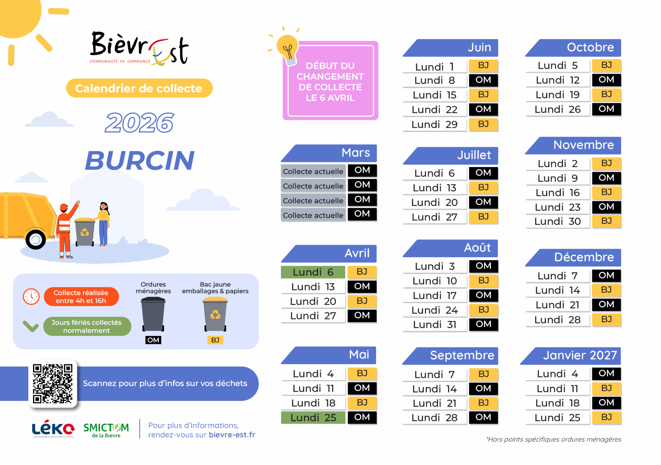 A partir du 6 avril 2026, la collecte sera faite chaque lundi, en alternance bac jaune/bac ordures ménagères